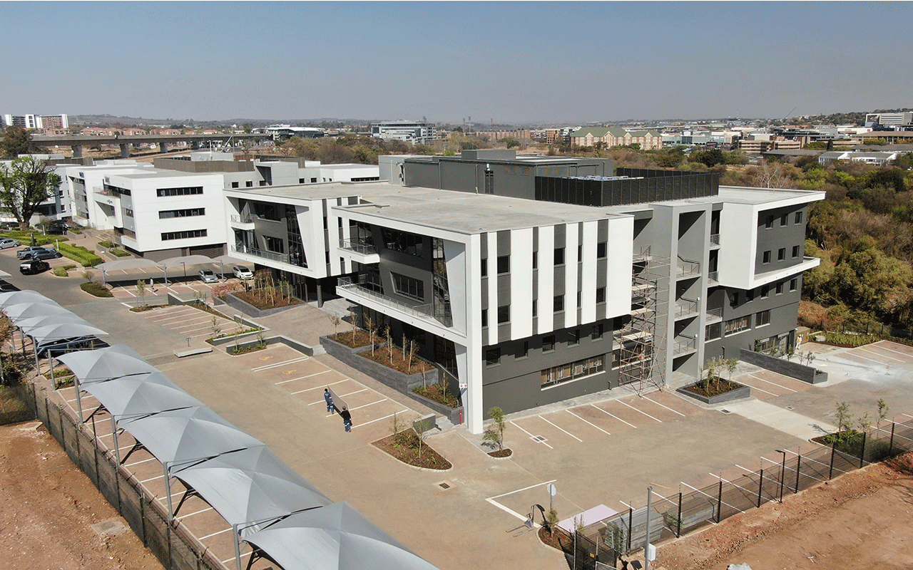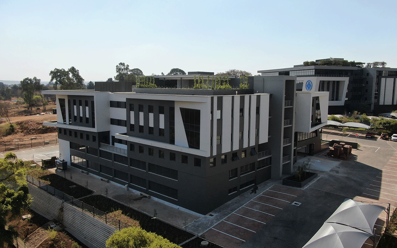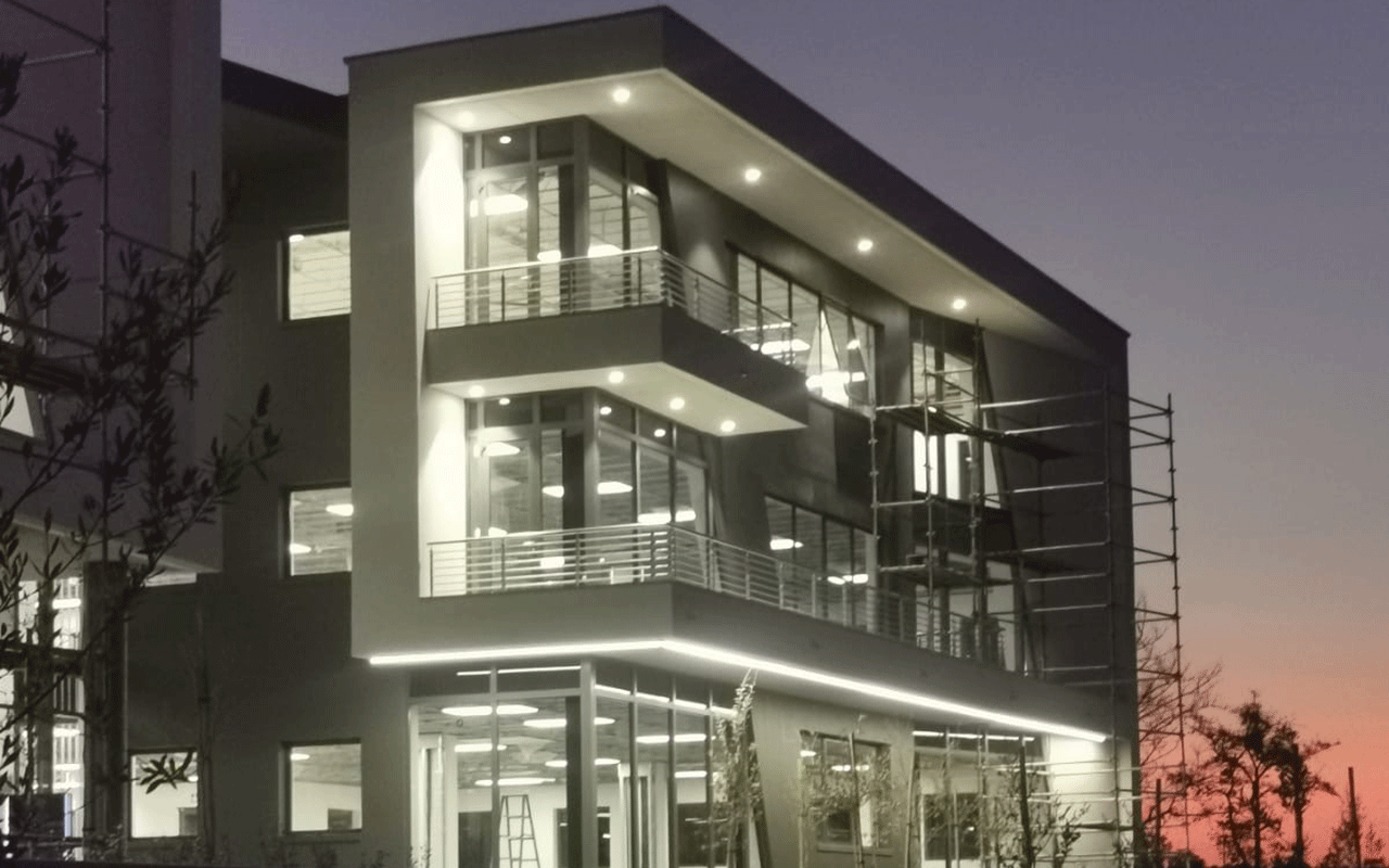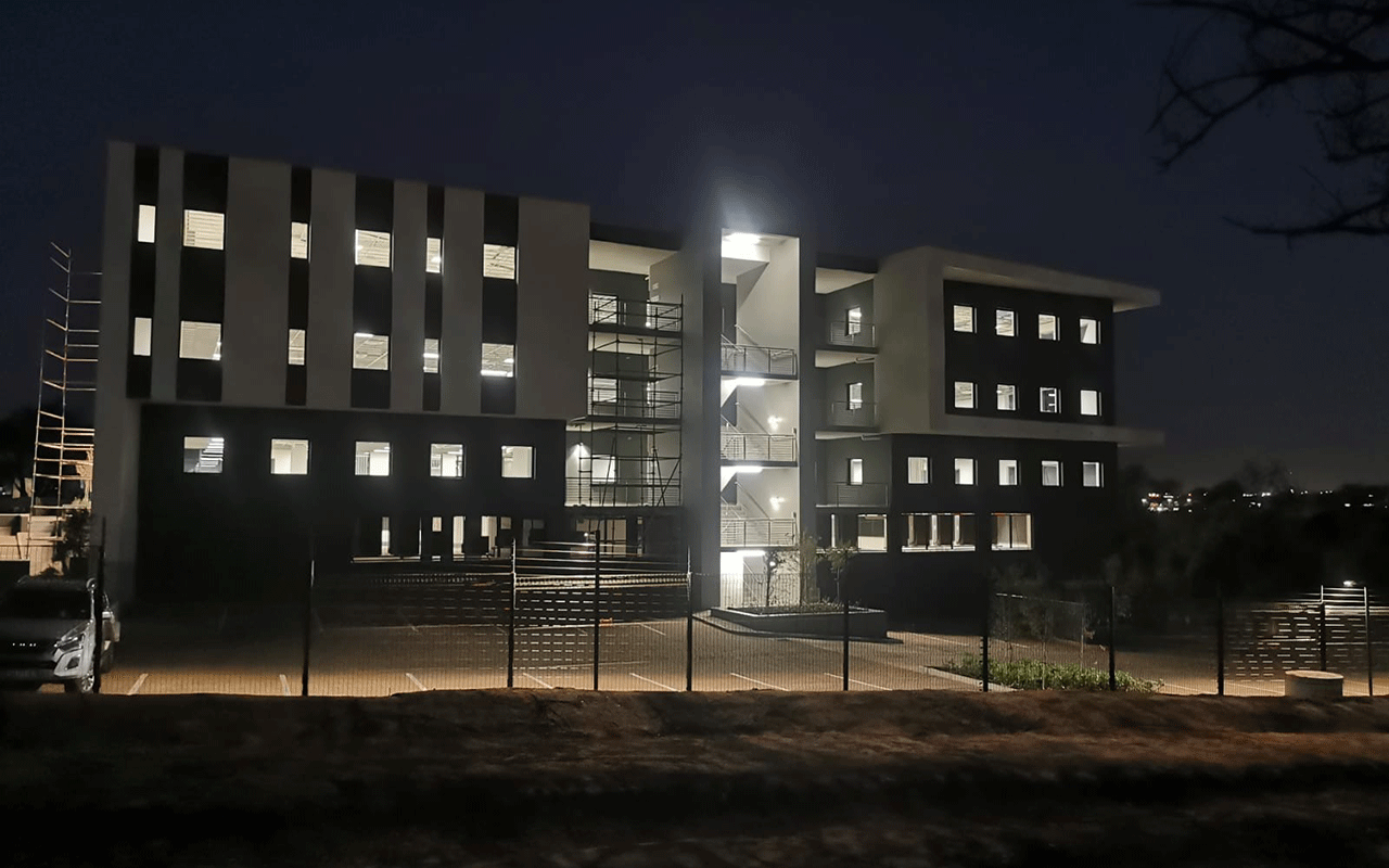 The construction of Building E, in Westend Office Park, has a gross rentable area of 4492m². This particular project was designed and built on a solid raft foundation structure. Westend Building E consisted of five levels of concrete with the basement raft utilising 1500m³ of concrete, and a 750mm-thick raft slab. These were all cast at once in fourteen hours of non-stop pouring. These five levels of structure included two basement levels, three office levels and a full Penetron-based roof slab. The structure was built in four months and the total project completed in eight months and three weeks. This was one of the fastest projects we have completed.